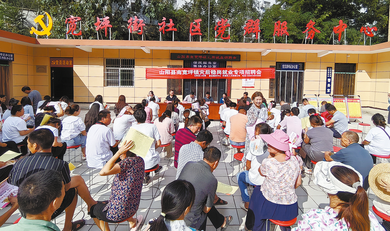 本報訊 (通訊員 張 斌)為進一步拓寬受災群眾就業增收渠道,助力災后恢復重建,8月27日,山陽縣人社局、就業服務中心、蘇通旺人力資源公司聯合南寬坪鎮在寬坪街社區召開災后穩崗就業專項招聘會。