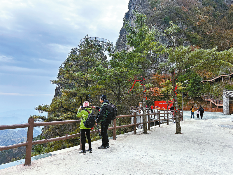 金秋時(shí)節(jié),秦嶺天竺山景區(qū)漫山遍野的樹葉由綠轉(zhuǎn)黃、由黃轉(zhuǎn)紅,色彩斑斕,微風(fēng)拂過,仿佛徜徉于旖旎畫卷,吸引了大批游客前來游覽觀賞。圖為10月26日,游客在天竺山景區(qū)觀賞紅葉、拍照打卡。 (本報(bào)記者 黃朝梅 攝)