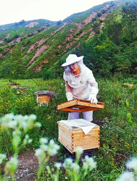 說干就干。今年,李偉利先是在村里拜師學習養蜂技術。5月份,他不顧母親和媳婦反對,投資6萬多元購買了70多箱土蜂和配套的物品,選擇了家鄉附近一條人跡罕至、名叫襄王溝的山溝開始養蜂。“這個地方是師傅推薦的,因為師傅說他經過這么多年觀察,襄王溝就是周圍所有蜜源的正中心位置,蜜蜂采蜜時飛行的距離比較短,工作效率就比較高。加上周圍幾公里都沒有人居住,是一個原生態、純天然、無污染的好地方。”李偉利說。