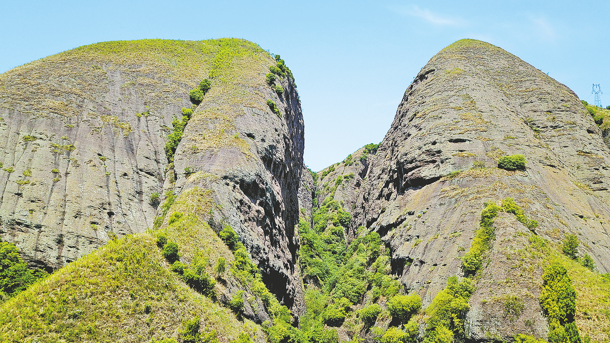 從夜村鎮過丹江后,沿水泥路進入澇峪溝村,我們就被一處形如二指的石山吸引,當地群眾說這叫二指山。這座石山和道路對面的山體形成了一座天然的山門,奇特的造型像是單手比出勝利手勢,在歡迎游客的到來。順著二指山旁的道路繼續前行,在山谷入口不遠處,左手邊的山體頂部出現一個碩大的山洞,仔細觀看,竟有一點星光在閃爍。沿水泥路向前,路邊山體圓潤,分別向東西方向自然散開,整體除了少量綠色植被以外均呈現暗紅色顆粒狀。高聳的山體相對而立,光影之下像兩個情人含情脈脈對視著互訴衷腸,又像兩個狹路相逢的武士怒目而立。在部分山體中部還不規則分布有連片山洞,山洞洞口呈人為開鑿的四方形。車行約3公里,山谷沿線并沒有人家居住,儼然一處秘境,只有附近的村民在此養蜂、養羊,發展產業。山谷深處僅有幾戶人家,讓整個山谷更加幽靜神秘。