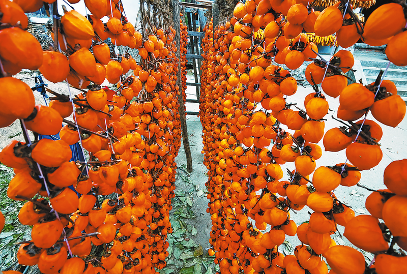 這些被村民高高掛起來進(jìn)行晾曬的柿子,每個(gè)都已經(jīng)被去了皮,將被制作成柿餅。去皮就是用傳統(tǒng)的手工去皮刀,將七八成熟的柿子表面削除。據(jù)村民介紹,柿子光滑的表皮具有一定的澀味,削除表層后通過晾曬、上霜,柿子更加甘甜可口、有韌性。
