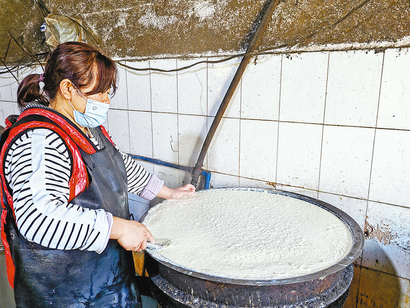 當記者來到惠民豆腐坊時,只見屋里擺放著磨漿機、大鍋、案板等物品,一個靠窗的角落里,村民張娥和兒媳婦張莉娜正麻利地把煮沸的豆漿點好鹵,嫻熟地包出一個個大小相似的雛形,有條不紊地制作豆腐干。