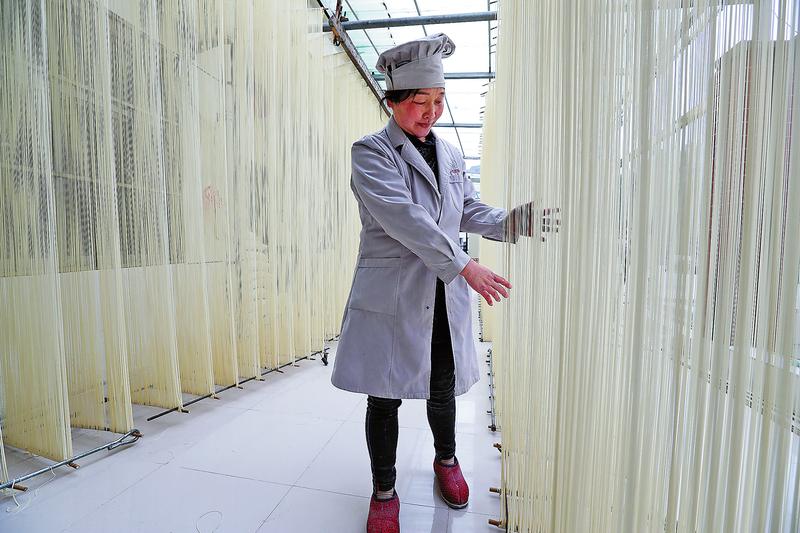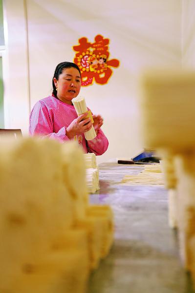 記者上前一打聽,原來是兩戶人家在制作傳統手工掛面,他們的手工掛面在當地很有名氣。有一戶的女主人名叫陳正芝,其家里做手工掛面已經有10多年歷史,但以前只是在老家做掛面,銷路不太好。自從她家搬遷至國道邊的古道溝移民搬遷點后,掛面生意漸漸好了起來,現在每年銷售掛面10多噸,一家人每年收入有十三四萬元。另一戶的女主人名叫艾萬玉,也是從山溝里搬遷到國道旁的移民搬遷點,每年銷售額也有10多萬元。