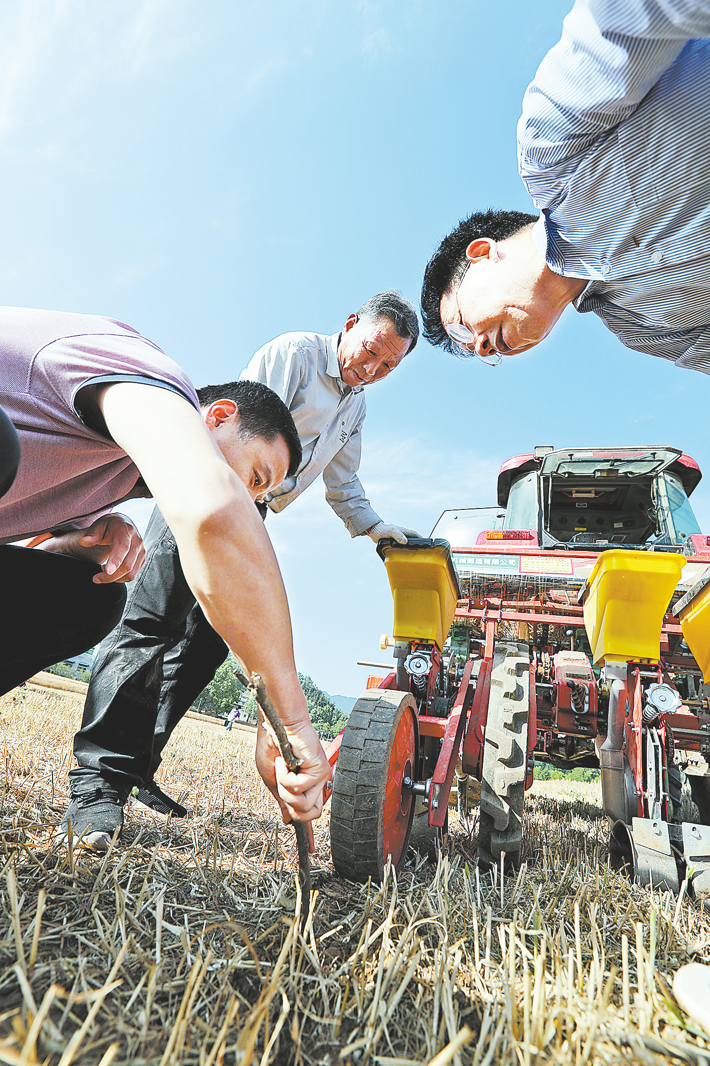 三要鎮永坪村有一處210畝的麥田,年均畝產400公斤。洛南縣農業農村局結合鄉村振興和糧食安全,在這里推廣小麥高產示范田建設。2020年以來,該縣以推廣小麥良種、配方施肥、壟溝施肥播種、開花期無人機植保、機械收割減損等五大核心技術為重心,開展小麥示范推廣。縣農業技術服務中心引進種植偉隆169和西農979兩個優質強筋小麥良種,提升小麥產量;通過配方施肥,在麥田統一畝施40%小麥配方肥50公斤,追施尿素15公斤,確保小麥合理養分利用,實現減肥增效;采用小麥壟溝施肥播種機,將種子播種在壟溝兩側,積聚雨水,為小麥提供充足的水分,抗旱保墑;小麥開花期采用植保無人機作業,統一開展“一噴三防”,減少小麥條銹病等病蟲害;貫徹“減損就是增產”的理念,采用極光TB80B型小麥收割機,將機收損失率控制在2%以內,秸稈機械還田,顯著提高土壤肥力。
