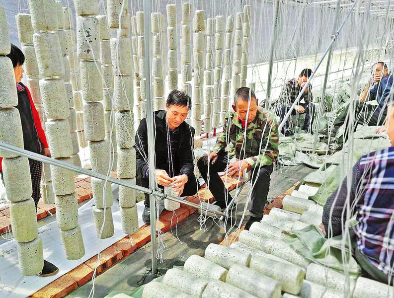 由村兩委利用產業(yè)資金委托集體經濟組織建設大棚,統(tǒng)一采購菌袋,按照一戶貧困戶承包一個大棚、掛袋2萬袋左右的標準,先期借給貧困戶進行種植,大棚及設施設備安全由各戶負責。村集體經濟組織為貧困戶提供技術指導、生產設施設備、互助資金支持,村委會協助辦理貼息貸款。曹坪鎮(zhèn)在柞水縣產業(yè)辦的支持下,聘請東北專業(yè)技術指導員,在基地直接給老百姓傳授種植管理技術。由村集體建吊袋大棚,購置打孔機,建好噴灌設施,配齊吊繩掛扣、保溫膜,村委會協助缺資金的種植戶申請農戶貸和互助資金,解決其資金困難。